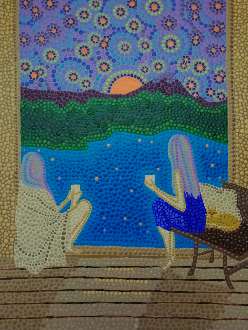Barátnők, pöttyöző technika, akril festék alapozott farost lemezen